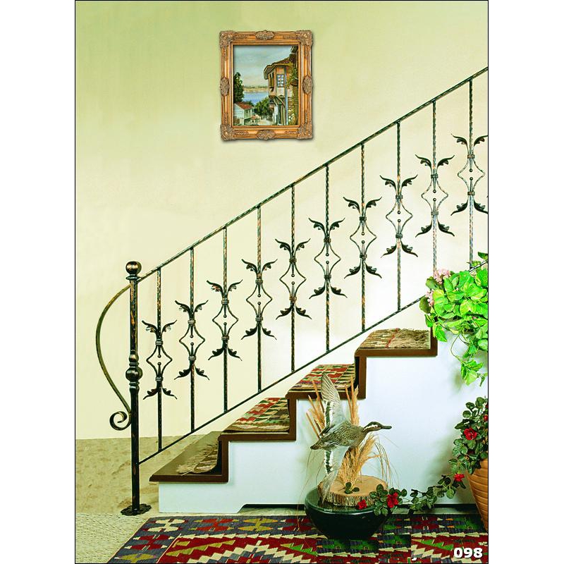 • Poteaux en fer plein, main-courante tubulaire largeur 50 mm, panneaux à barreaudage en fer plein de 12 x 12 mm.